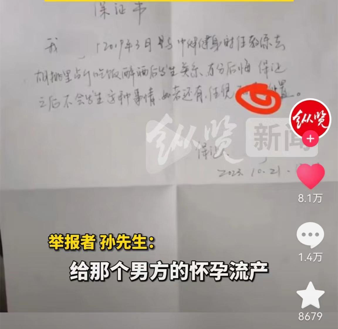 爲了保護王某,張某騙孫先生說當時懷了一個健身教練的孩子。爲了讓丈夫相信自己,張某還寫了一份保證書。
