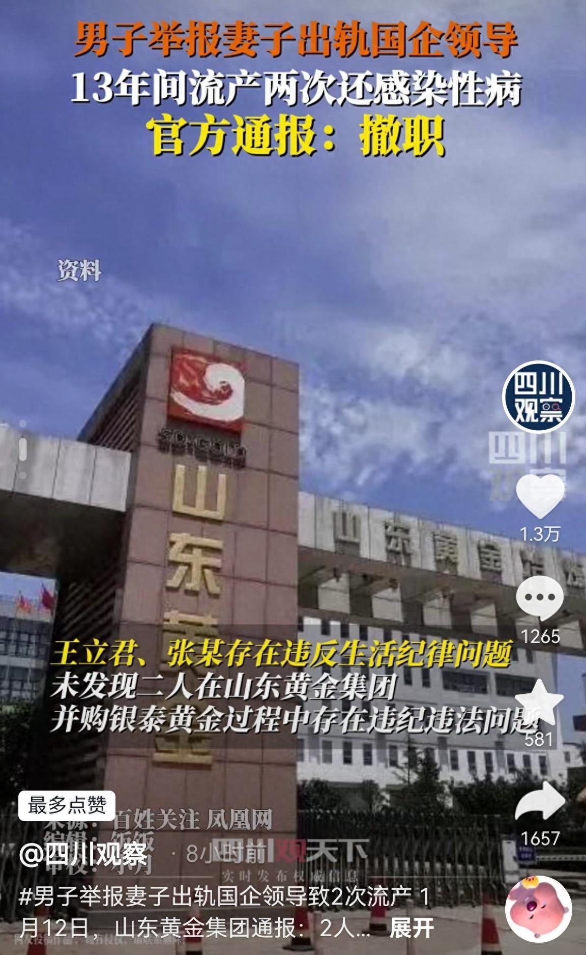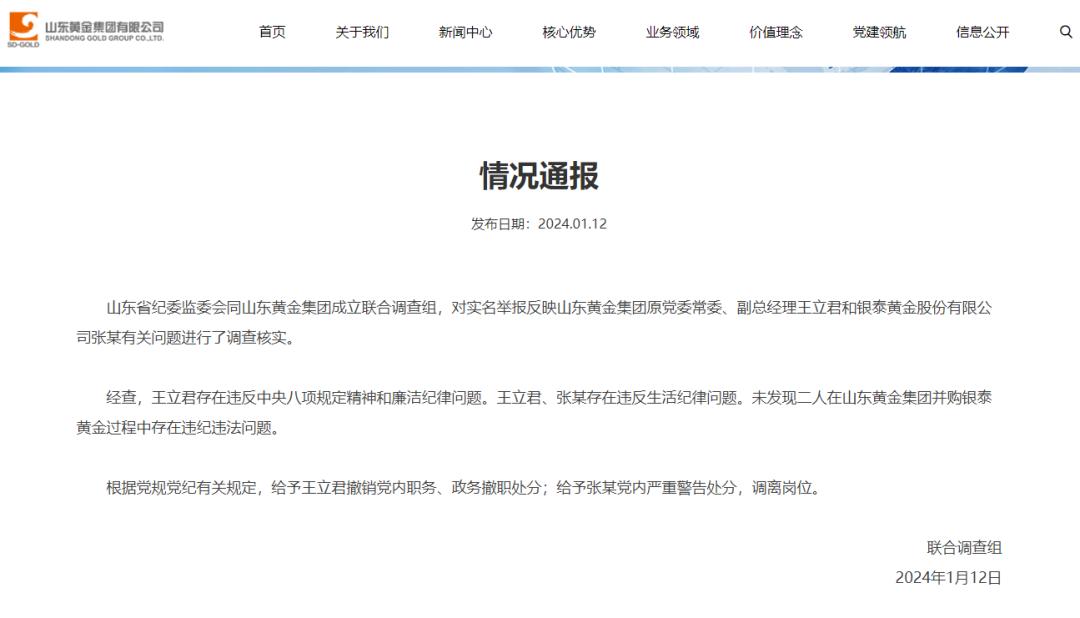 1月12日,山東省紀委和山東黃金成立的聯合調查組發佈了關於針對王某、張某實名舉報的最終情況通報。