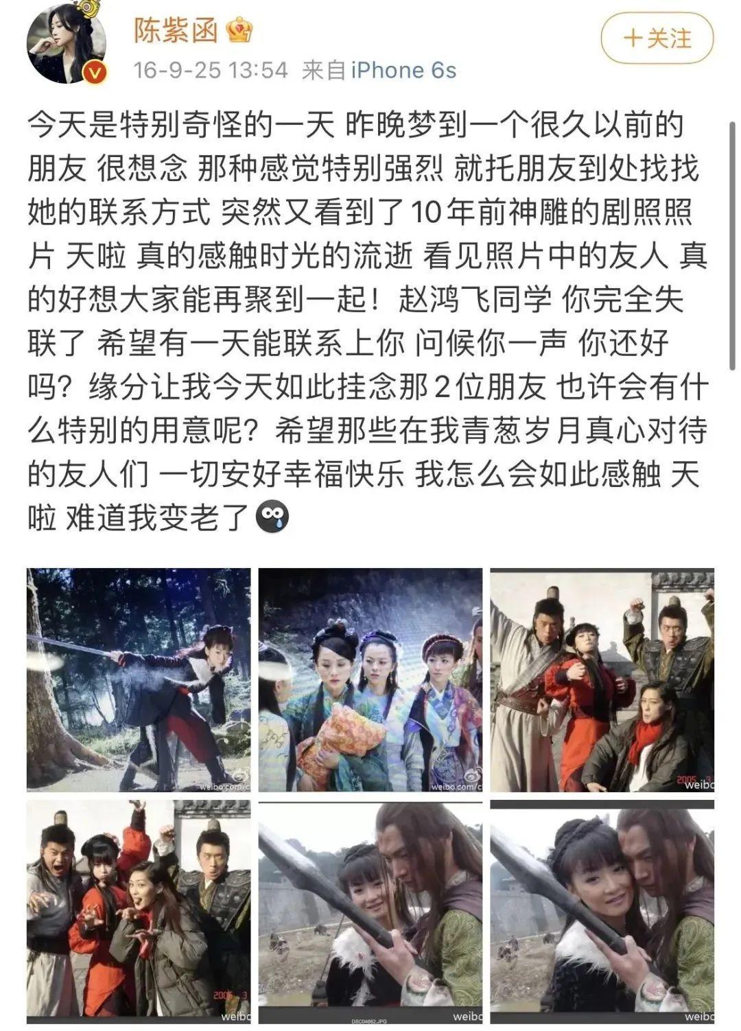 2016年的時候,和趙鴻飛一起合作過《神鵰俠侶》的陳紫函,還曾在微博發文尋找趙鴻飛。