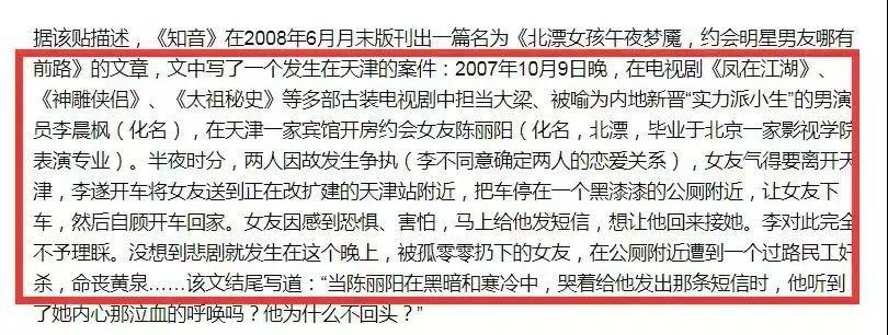 文章中稱:“一位北漂女孩在和一名演員男友約會,在深夜發生了爭吵,演員男友一氣之下將女孩送到了黑漆漆的公廁附近,然後便獨自開車回家。結果女孩感到恐懼和害怕,並給演員男友發了短信求救,結果被不予理睬和視而不見,最後導致女孩遭遇了歹徒,最終不幸遇害。”