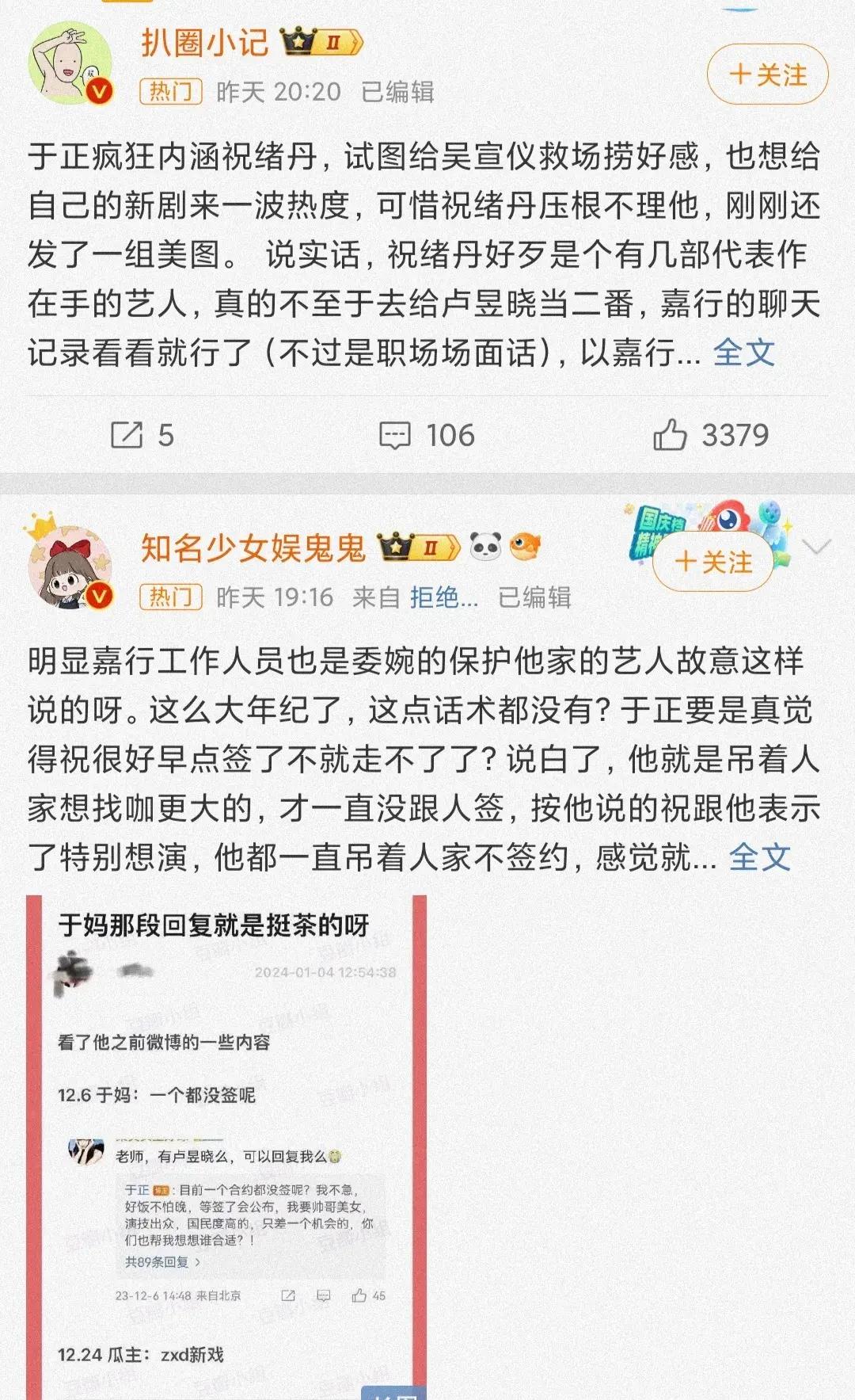 還有大V發文,認爲於正的做法很low,內涵女演員,試圖給吳宣儀救場博好感,順便給新劇來一波熱度。