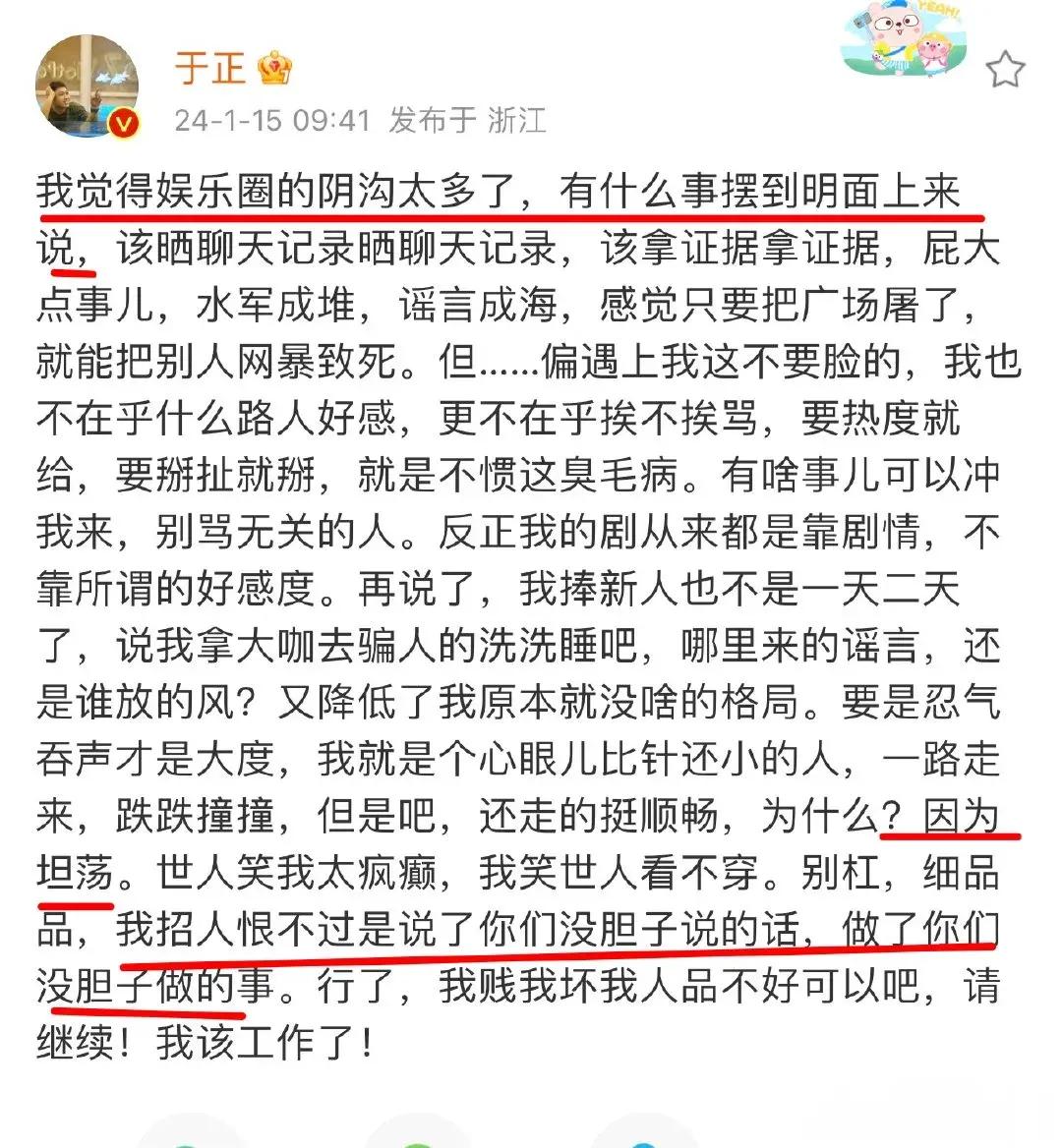 1月15日,一大早,於正就陰陽祝緒丹一事,再次在社交平臺發文回應:“娛樂圈陰溝太多,有什麼事,擺到明面上說”!