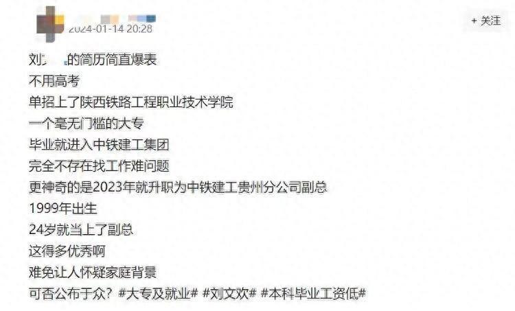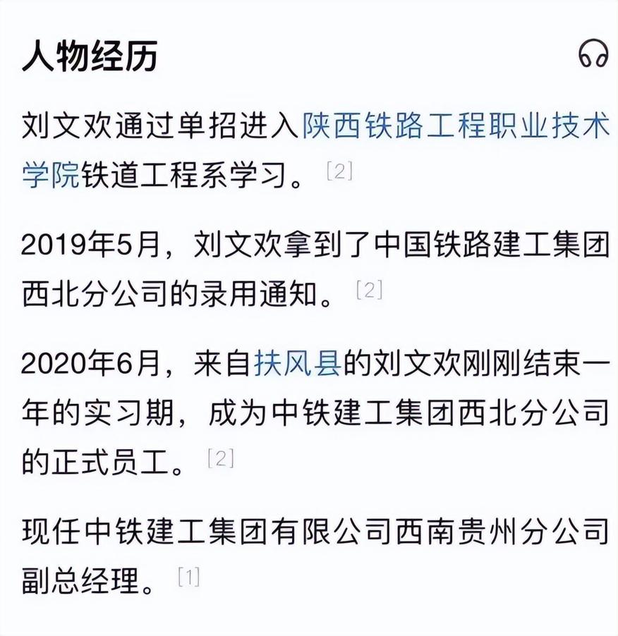 根據該介紹可知,劉某歡1999年出生,2020年參加工作,擁有本科學歷,曾擔任過中鐵建工集團西南分公司的助理工程師,現在是中鐵建工集團貴州分公司的副總。