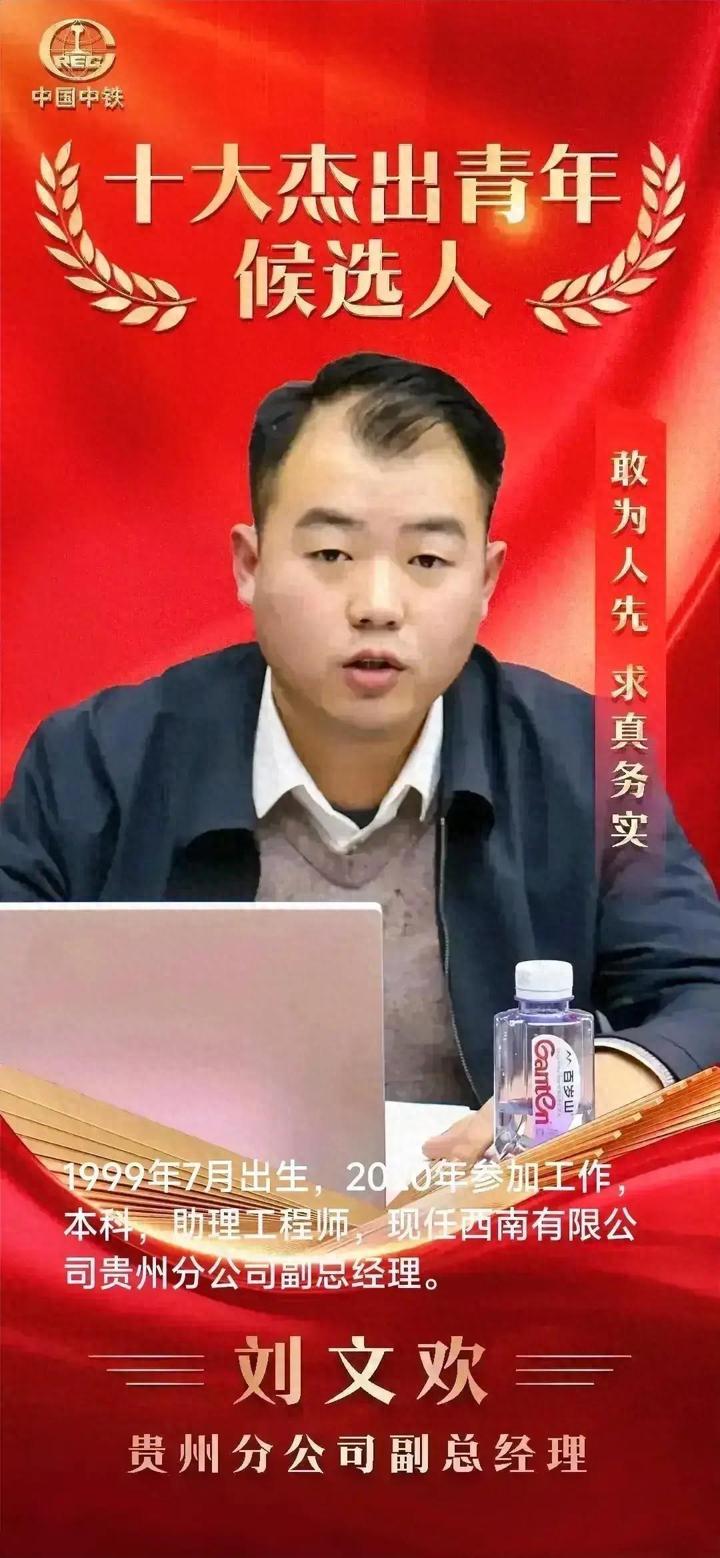 根據相關公告可知,這位24歲的副總名叫劉某歡,中鐵建工集團貴州分公司的上級公司中鐵建工集團西南分公司曾在一篇名爲《西南分公司第三屆十大傑出青年正式候選人投票開啓》的文章中對劉某歡進行了介紹。