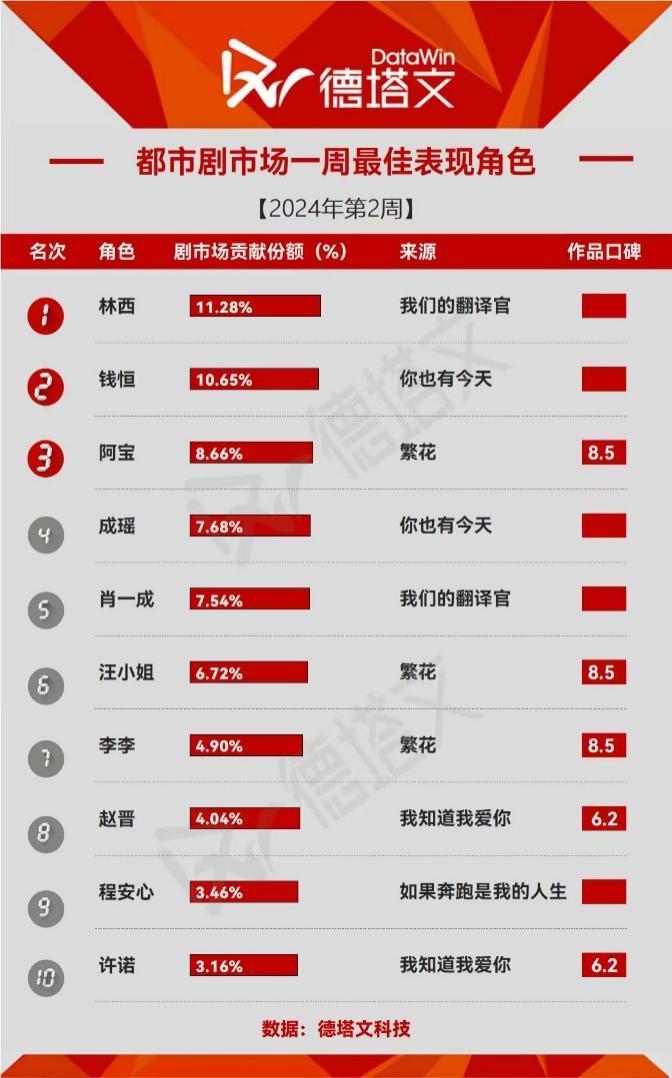 播出首周,《我們的翻譯官》即拿下德塔文都市劇表現最佳的角色周榜冠軍、貓眼全網劇集集均有效播放周榜冠軍,而其中宋茜還位列都市劇市場一週最佳角色!