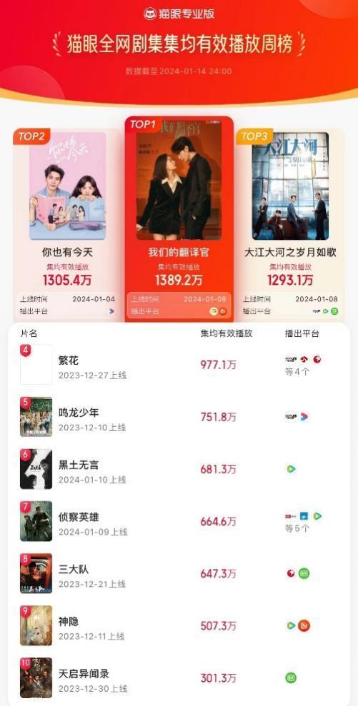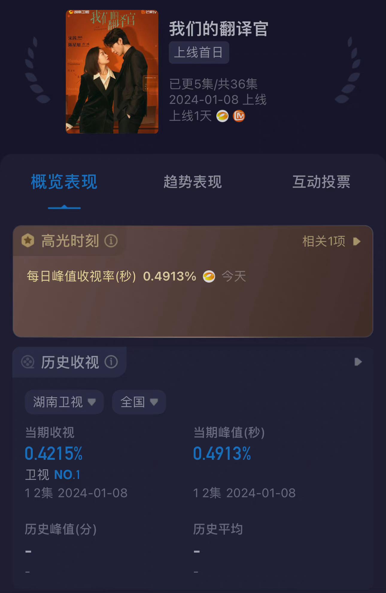 在酷雲平臺的數據中,《我們的翻譯官》首播就拿到了0.42的好成績,峯值則是到了0.49,創下了湖南衛視近四個月收視率的新高!