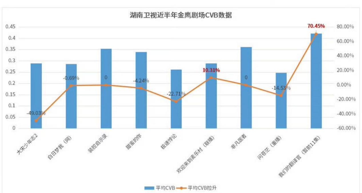 這一提升,讓湖南衛視的cvb拉昇率高達70.45%,一舉扭轉了其半年來的頹勢,拯救了湖南衛視的收視率!
