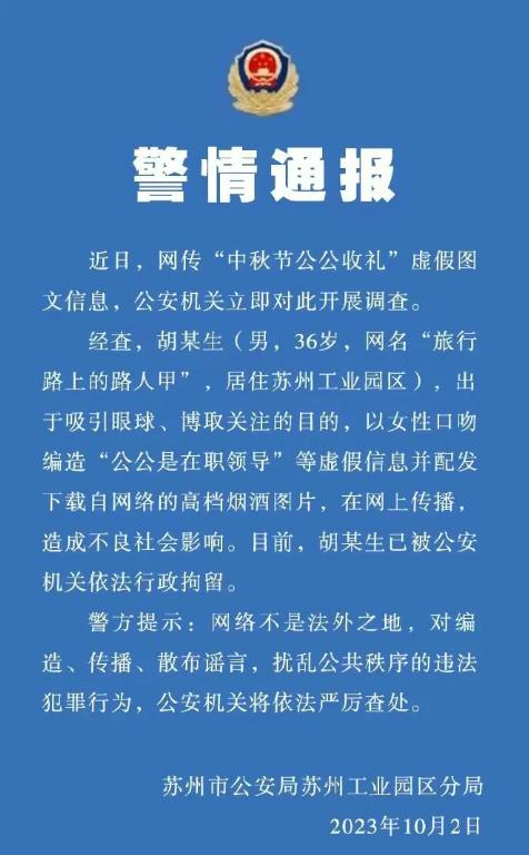 根據通報可知,“旅行路上的路人甲”是一名36歲的男子,他爲了吸引眼球,博取關注,以女性口吻編造“公公是在職領導”等虛假信息。