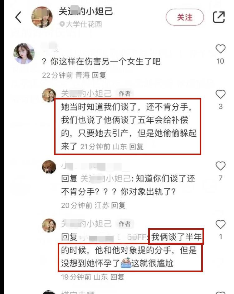 面對網友的質疑,該女子回覆網友說男朋友的女友當時知道他們談戀愛了,在他們談了半年的時候,她男朋友就和女朋友提出分手,但是男朋友的女朋友意外懷孕了。