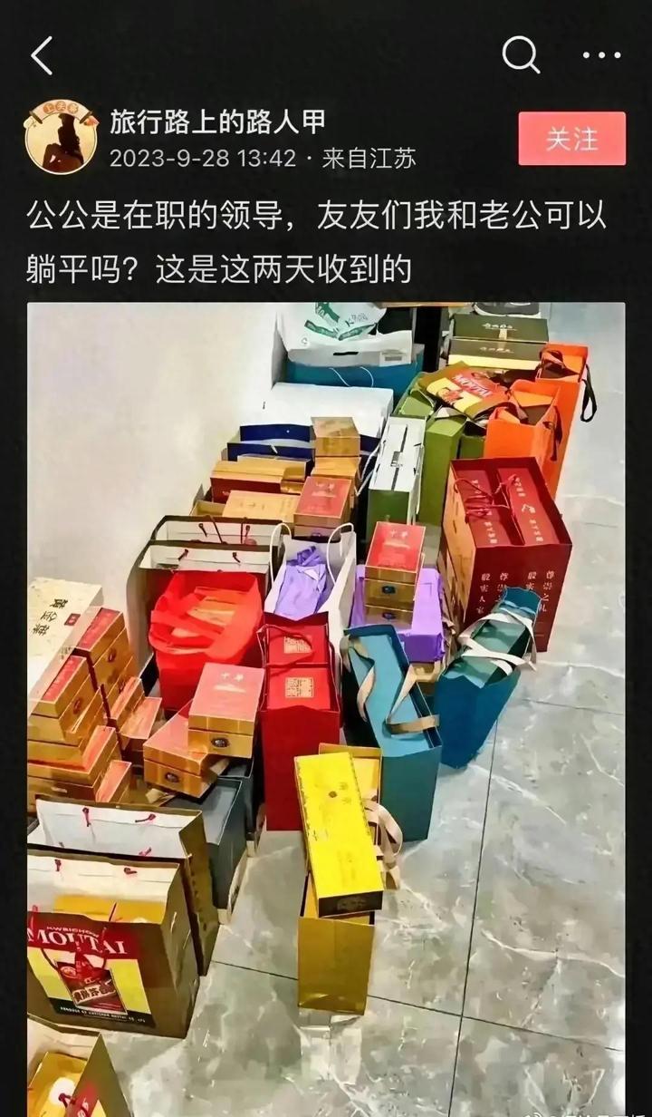 去年9月28日,一位網名爲“旅行路上的路人甲”的網友在網上發帖稱:“公公是在職領導,友友們,我和老公可以躺平嗎?這是這兩天收到的。”