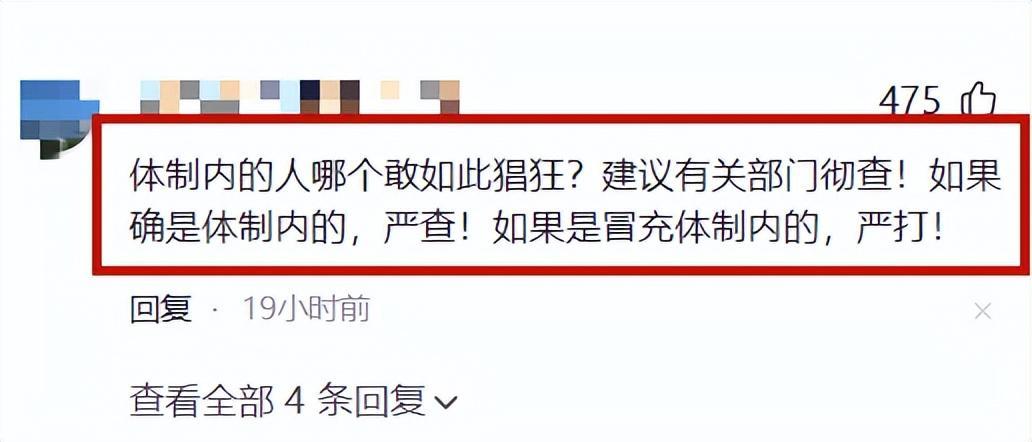 有網友說:“體制內的人哪個敢如此猖狂?建議有關部門徹查!如果確是體制內的,嚴查!如果是冒充體制內的,嚴打!”