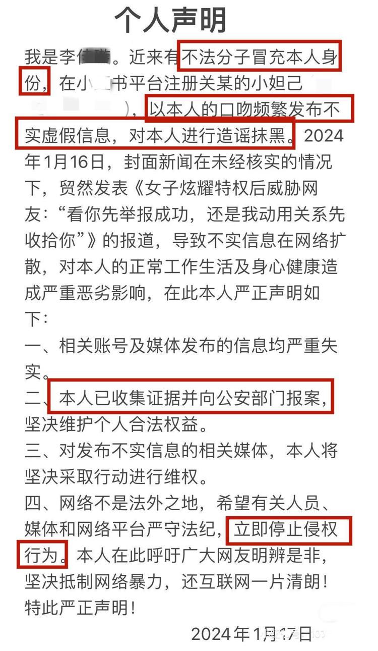 因爲,一位自稱是李某某的網友發文了,她說她被不法分子冒充身份,註冊賬號“關某的小妲己”,以她的口吻頻繁發佈不實虛假信息,對她進行造謠抹黑。