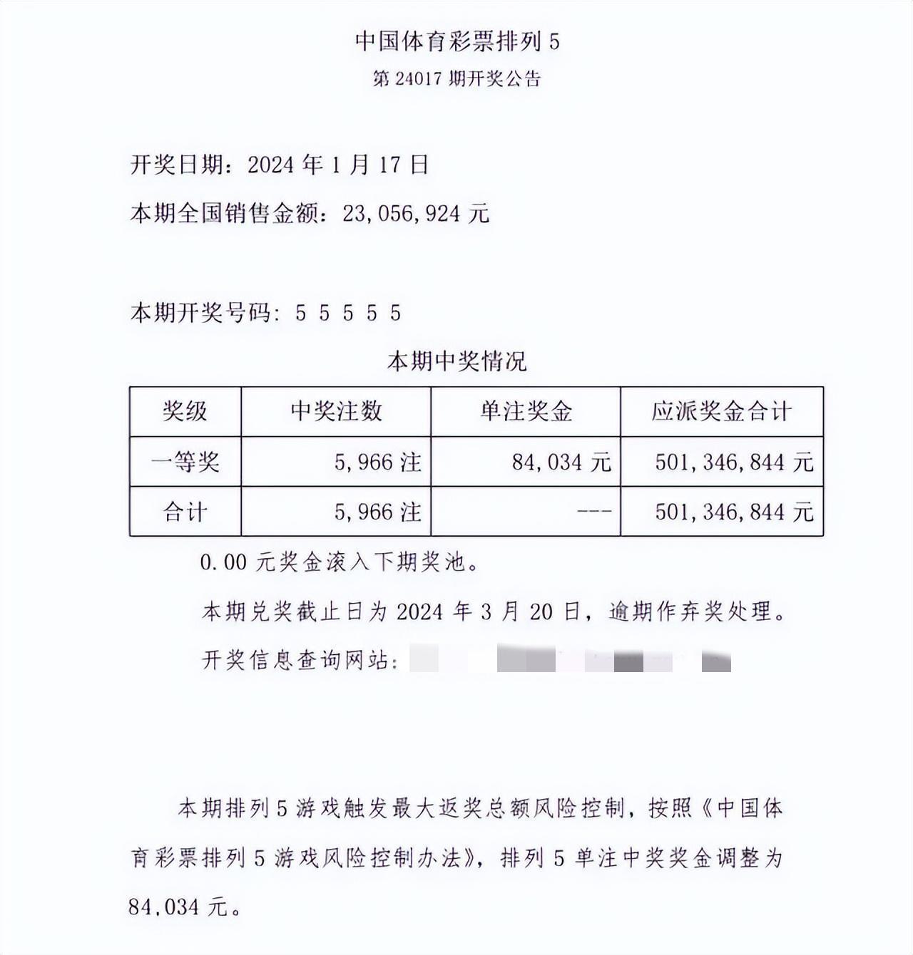 根據體彩網公佈的信息,這一次,排列5單注獎金爲84034元,一等獎中獎注數爲5966注,應派獎金合計約5.01億元,獎池被清零。