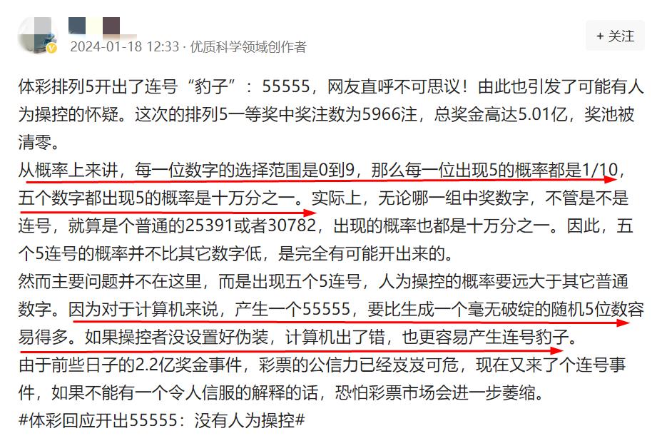 與此同時,有科學領域的大V算了一下體彩開出55555的概率。