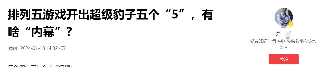 彩票專家蘇某某發文稱排列5的中獎概率是10萬分之一,5個5是超級豹子號,很少開出,他說在他的印象裏,至少20年這個號沒有開出過。