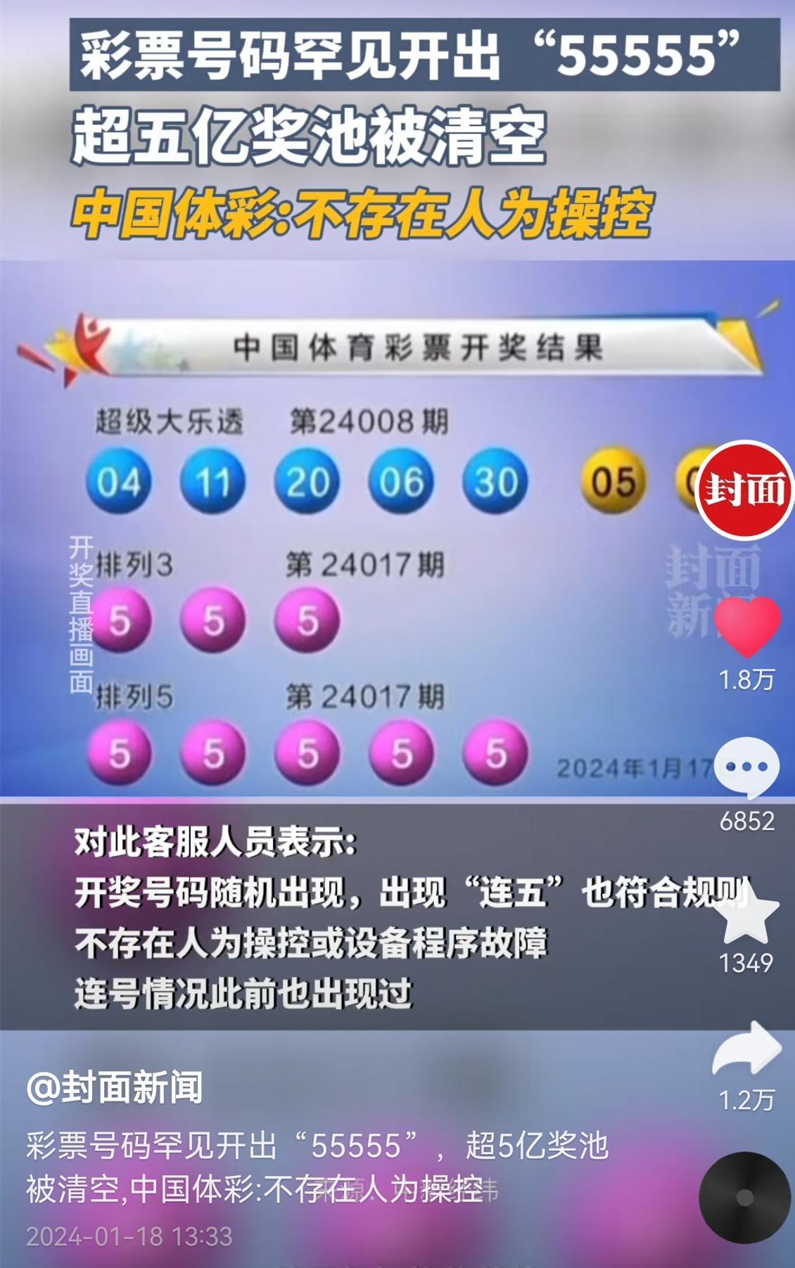 體彩開出55555,5億獎池清空,官方稱沒有人爲操縱,評論區一邊倒