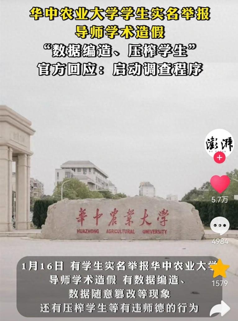 其次,華中農業大學成立工作專班,啓動調查程序,並表示對學術不端行爲零容忍。
