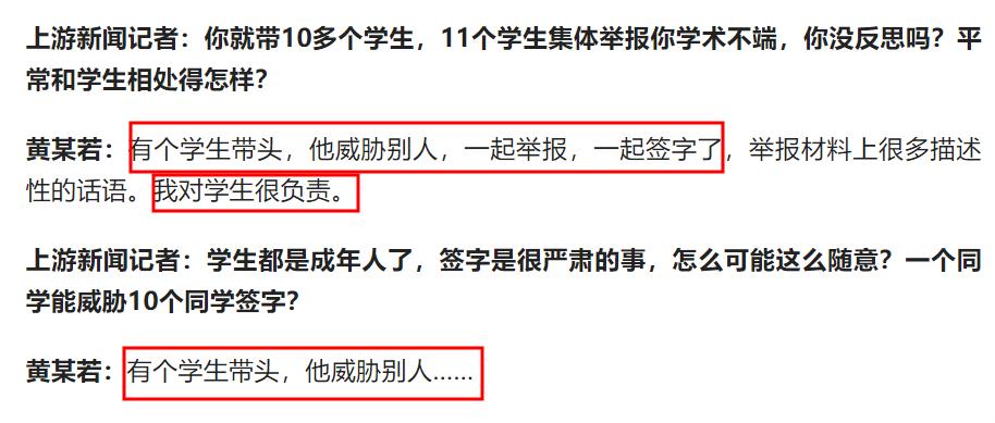 對於此,黃教授依舊堅持自己的說法,“有個學生帶頭,他威脅別人……”