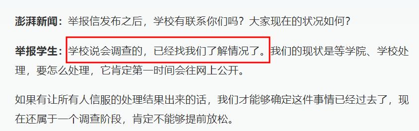 當媒體問他有沒有將回復材料交給學校,他說還沒有,並且直言截至他接受媒體採訪,學校暫時還沒有找他了解情況,他說“相信學校會有個客觀的調查”。
