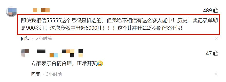 有網友直言:“即使我相信55555這個號碼是機選的,但我絕不相信有這麼多人能中!歷史中獎記錄單期是900多注,這次竟然中出近6000注!!!這個比中出2.2億那個獎還假!”