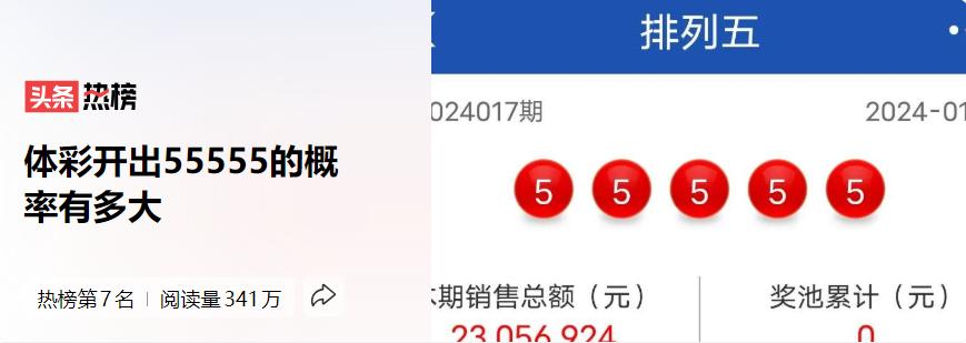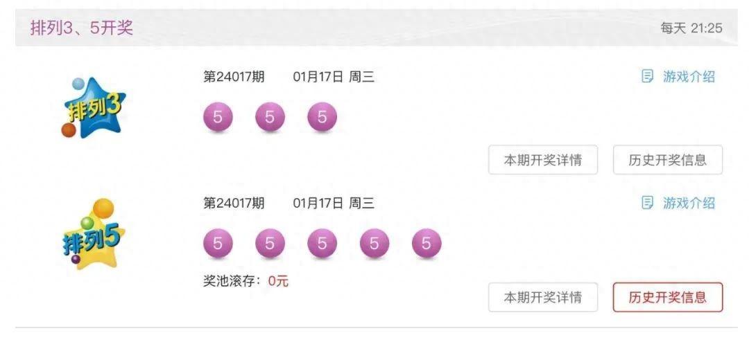 1月17日,中國體彩最新開獎結果出爐,此次結果震驚了萬千網友,排列3和排列5均出現了“連五”組合。