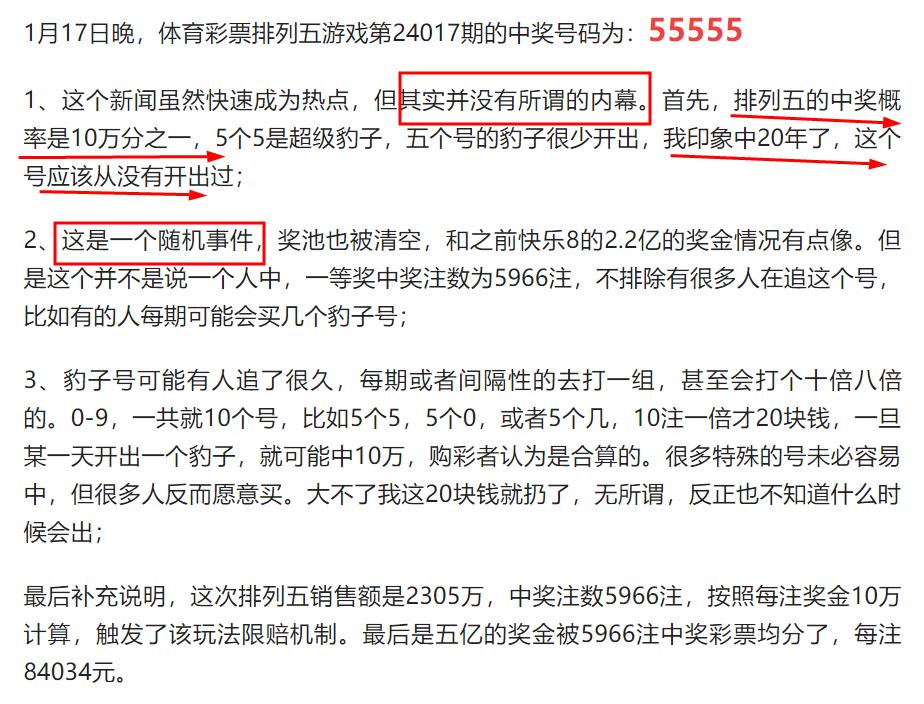 因此,該大V認爲五個5連號的概率並不比其它數字低,是完全有可能開出來的。