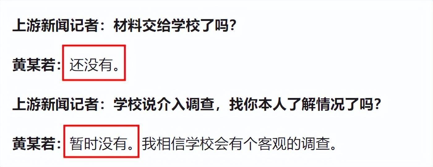 當媒體問他有沒有將回復材料交給學校,他說還沒有,並且直言截至他接受媒體採訪,學校暫時還沒有找他了解情況,他說“相信學校會有個客觀的調查”。