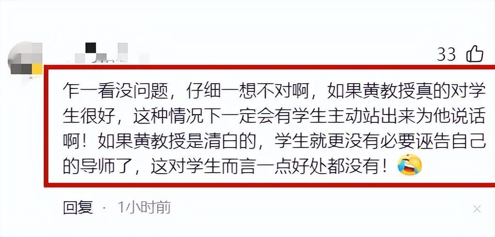 其次,有網友直言如果黃教授真的對學生好,他現在遭遇此事,應該有學生站出來爲他說話,但是沒有。該網友還說如果黃教授真是清白的,學生更沒必要誣告他,因爲這對學生們沒有什麼好處。