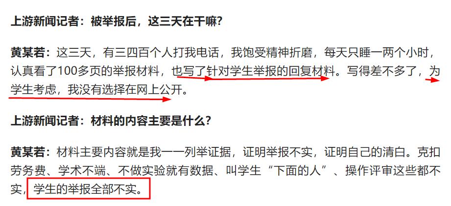 有媒體聯繫上了黃教授,黃教授告訴媒體這3天,因爲被學生舉報這件事情,有三四百個人給他打電話,他飽受精神折磨。