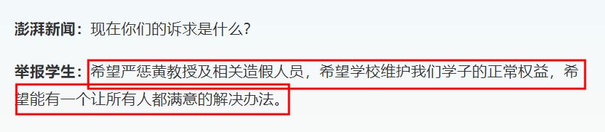 那便是“希望嚴懲黃教授及相關造假人員,希望學校維護我們學子的正常權益,希望能有一個讓所有人都滿意的解決辦法。”