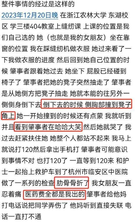 該女生髮帖稱她被男同學抽走板凳,導致骨折。