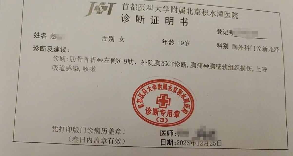 通過小趙曬出的北京積水潭醫院的診斷證明書可知,小趙左側8-9肋骨骨折,還有胸痛、胸壁軟組織損傷等情況。