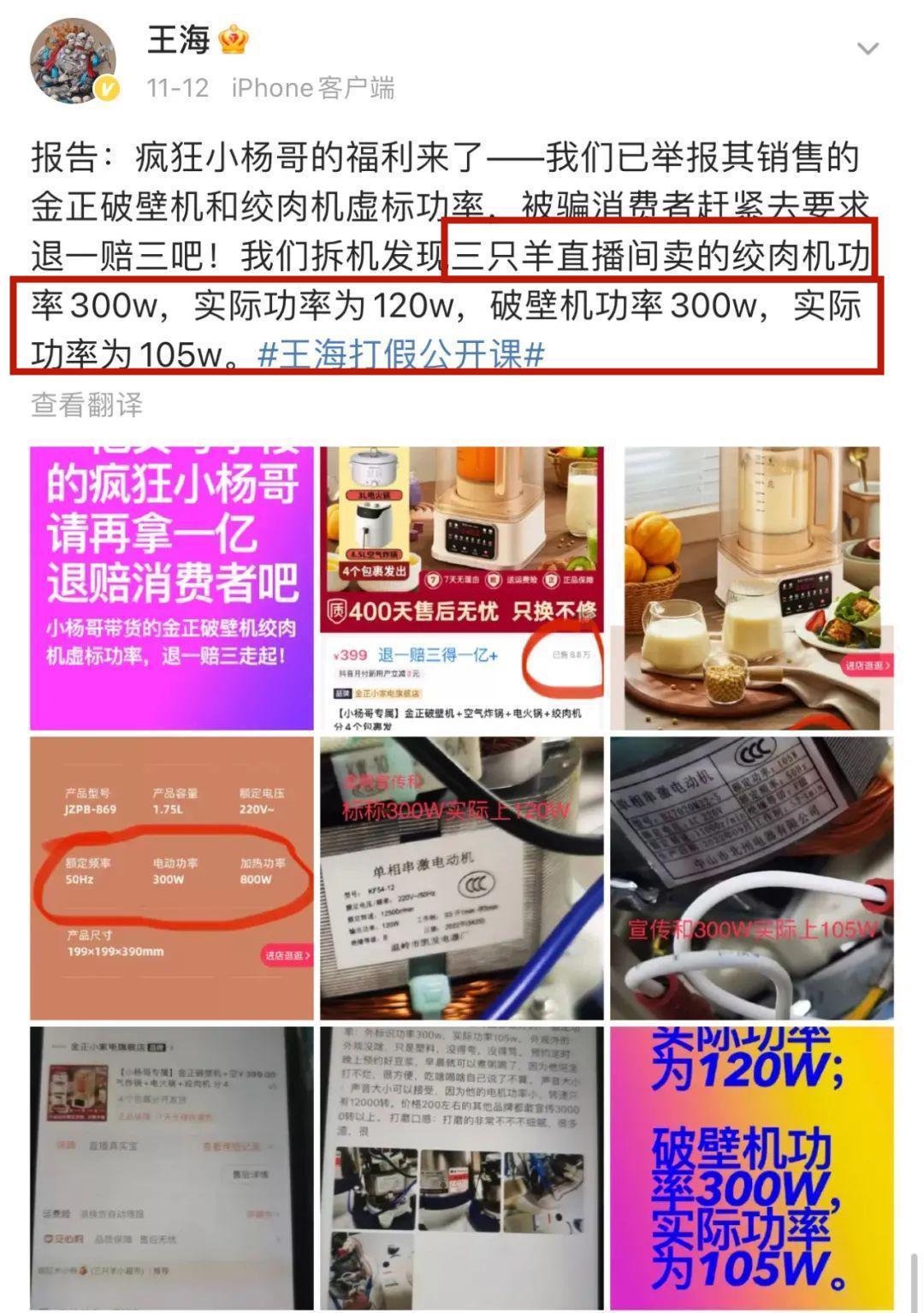 2022年11月,王海就舉報小楊哥售賣的破壁機和絞肉機虛標功率。