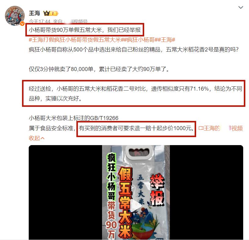 王海發文稱小楊哥帶貨90萬單假五常大米,他已經舉報。