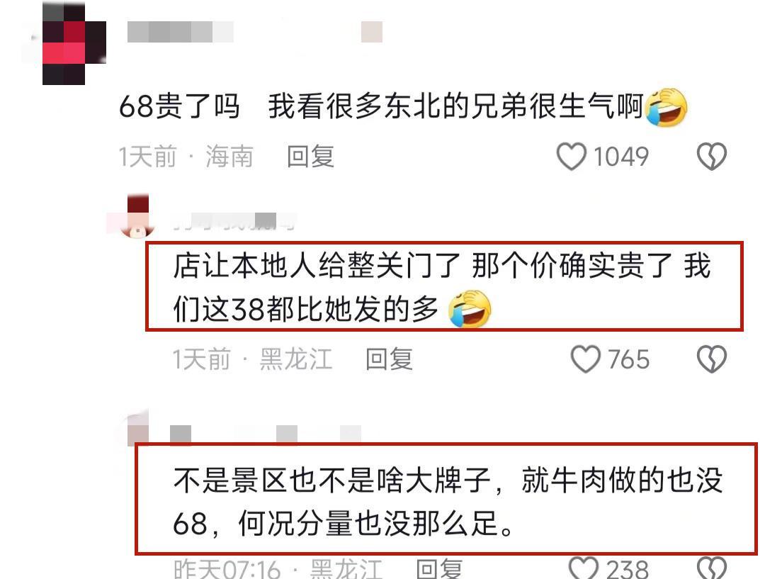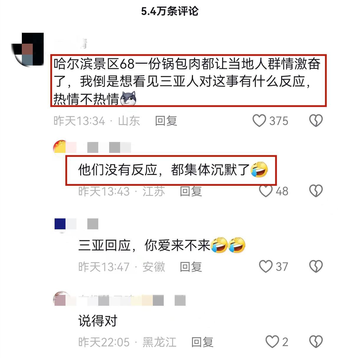 又因爲這件事情,網友對比了哈爾濱的68元鍋包肉事件,喊話三亞網友敢不敢“清理門戶”。
