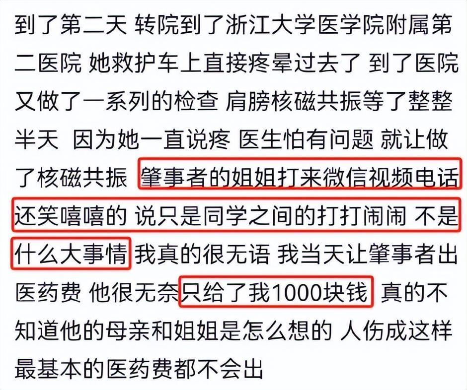 到了浙江大學醫學院附屬第二醫院,在他的要求下,肇事男生纔不情願的出了1000元醫藥費。