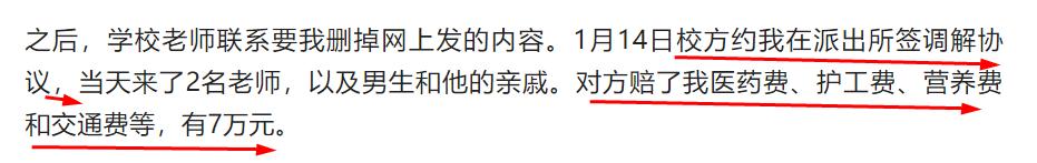 最終在1月14日,在學校的安排下,小趙在派出所和肇事男生簽訂了調解協議,兩人和解了,肇事一方賠償了小趙醫藥費、護工費、營養費、交通費等費用,共計7萬元。