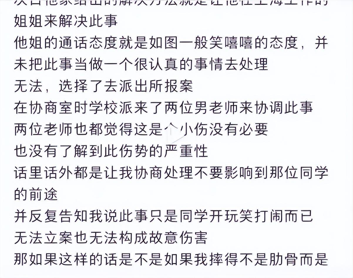 學校領導還告訴她,此事無法立案,也無法構成故意傷害,傷情也無法鑑定爲輕傷。
