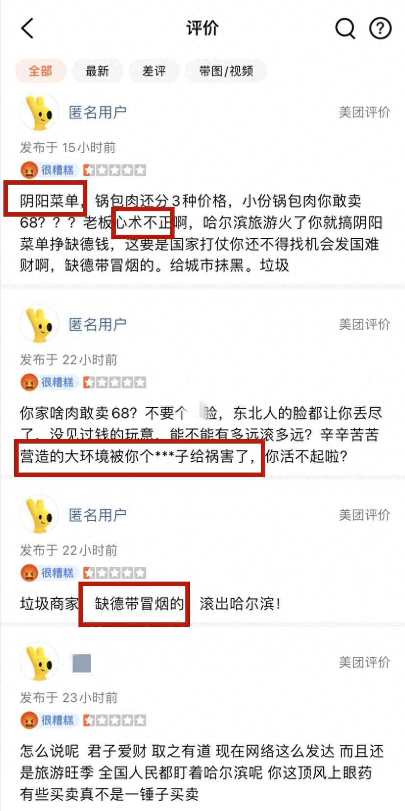 她這一吐槽不得了,哈爾濱的網友怒了,他們覺得涉事飯店在抹黑哈爾濱。