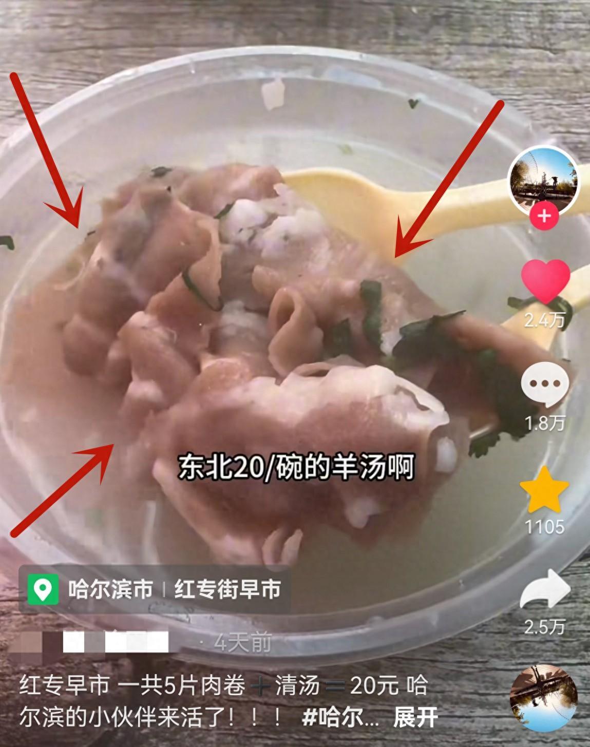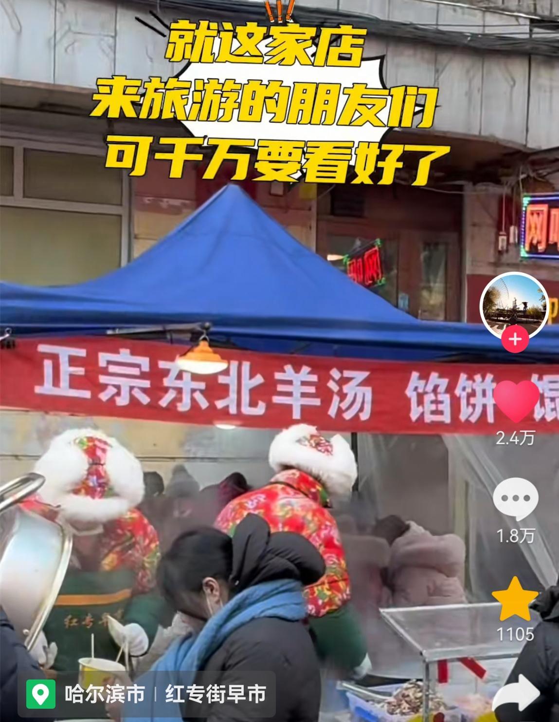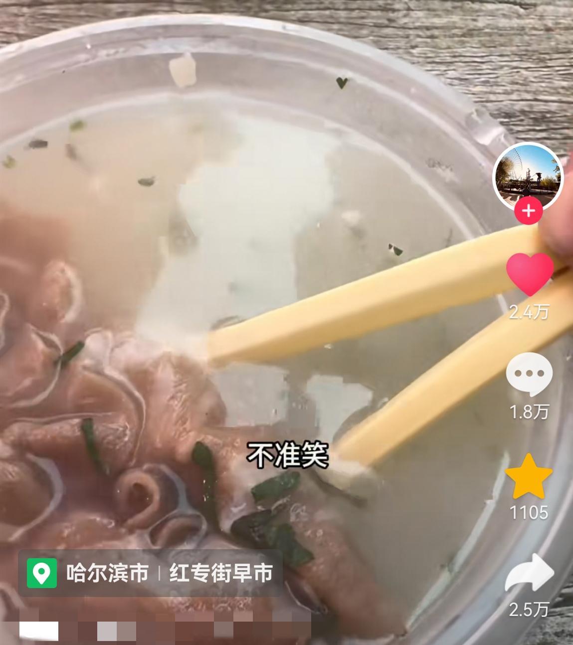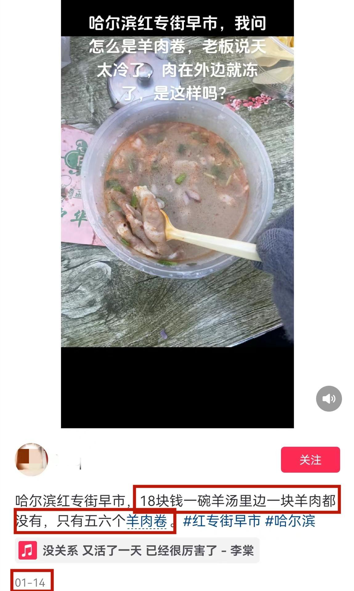 1月17日,一位到哈爾濱旅遊的網友在短視頻平臺發佈了一條視頻,視頻內容主要是吐槽在哈爾濱紅專街早市買到的羊湯。