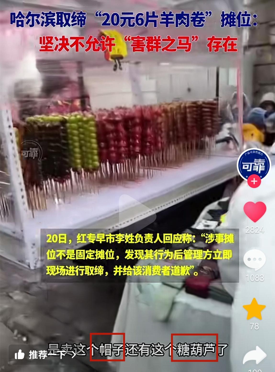 如今,涉事攤位的原地址上出現的是賣帽子和糖葫蘆的攤位。