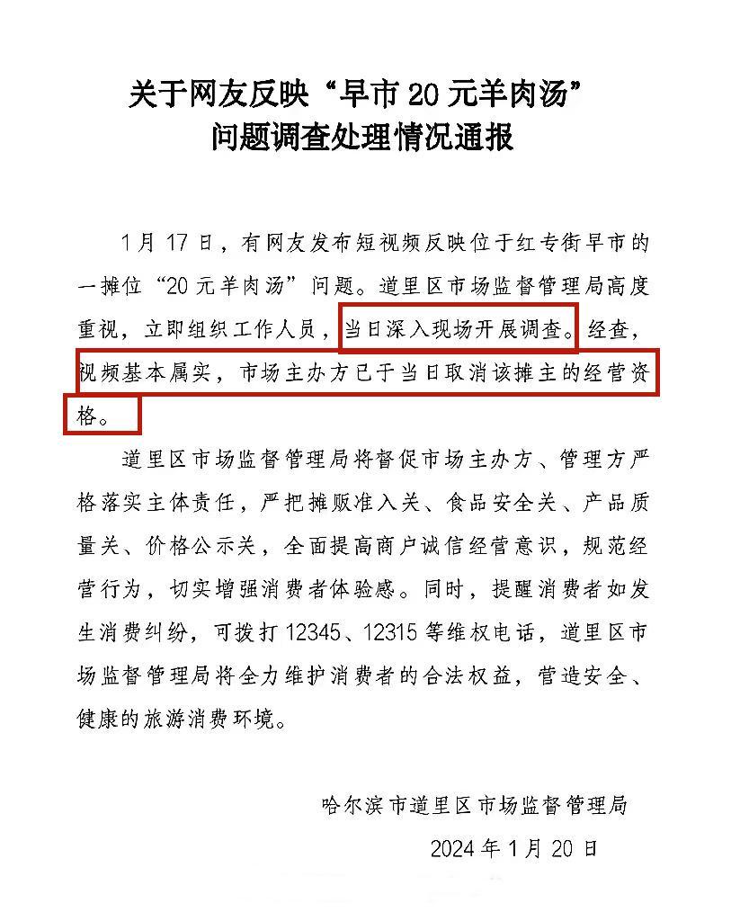 而在1月20日,哈爾濱市道里區市場監督管理局發佈了對早市20元羊肉湯事件的情況通報。