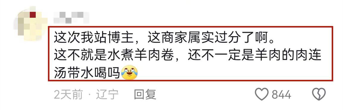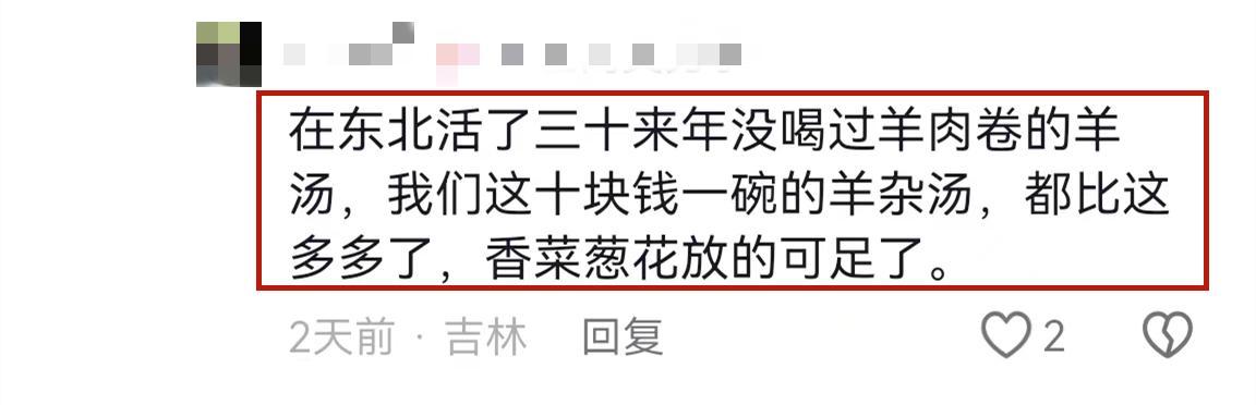 有網友說在東北生活了30多年,沒喝過羊肉卷的羊湯,該網友還說10元一碗的羊雜湯,料都比這多。