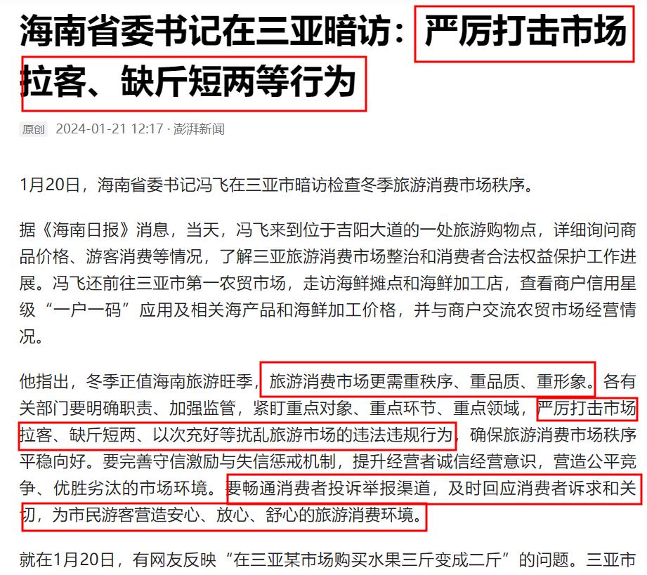 暗訪結束後,省委書記指出“冬季正值海南旅遊旺季,旅遊消費市場更需重秩序、重品質、重形象。”