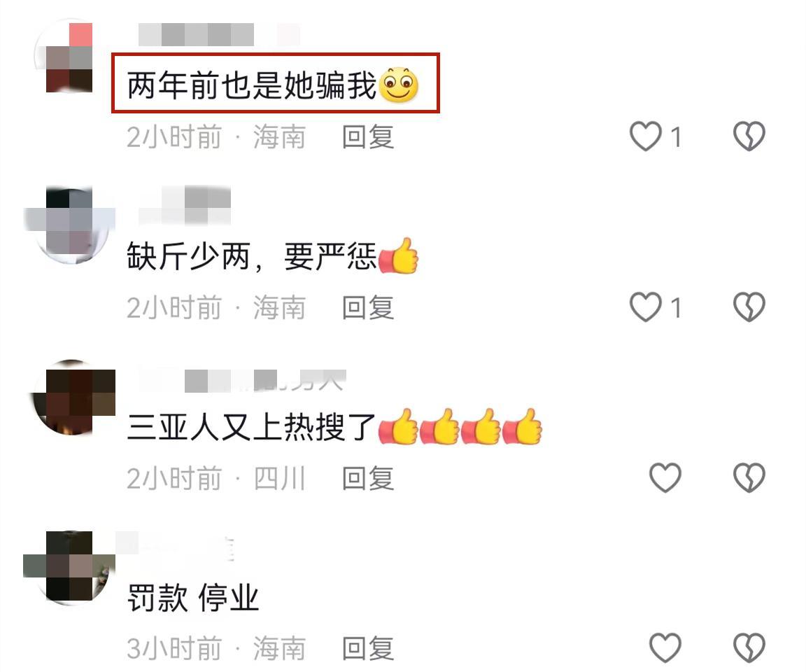 衆多海南網友表示讓該網友報警抓涉事攤販,並表示這種現象在三亞不是一天兩天了,本地人去買也一樣缺斤少兩。