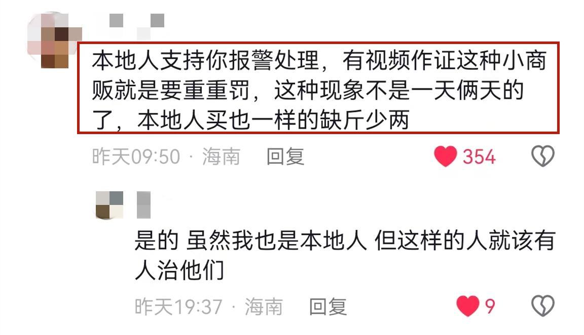衆多海南網友表示讓該網友報警抓涉事攤販,並表示這種現象在三亞不是一天兩天了,本地人去買也一樣缺斤少兩。