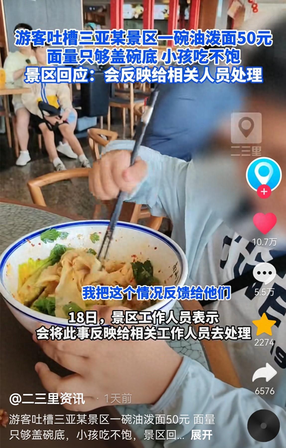 對於飯店裏50元一碗的油潑面,孩子的媽媽能夠接受價格,畢竟她也知道景區的食物價格通常都比較貴。