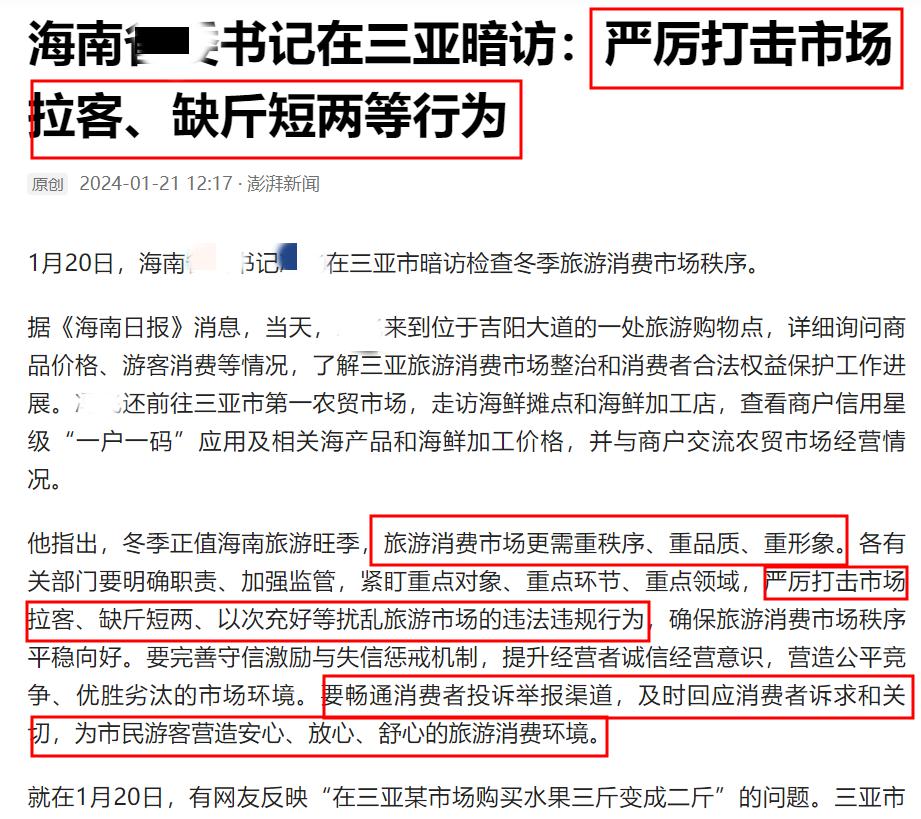 也許是因爲這些宰客情況發生得有點多,海南省的領導都被驚動了。