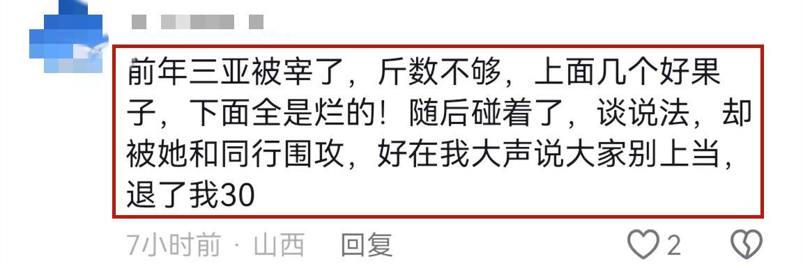 有網友說他前年去三亞旅遊,買水果也遭遇了缺斤短兩,並且還有水果是爛的,他當時討要說法,結果卻被賣水果的人和他的同行圍攻。最後是他大聲對其他遊客呼喊別上當,商家才退了他30元。