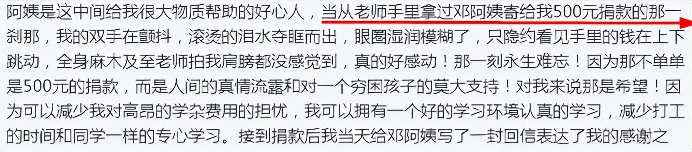 他回憶說:“當從老師手裏拿過鄧阿姨寄給我的500元捐款的那一剎那,我的雙手在顫抖,滾燙的淚水奪眶而出,眼圈溼潤模糊了,只隱約看見手裏的錢在上下跳動,全身麻木,真的好感動!那一刻永生難忘!”